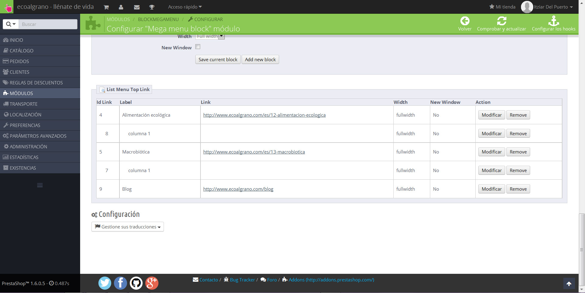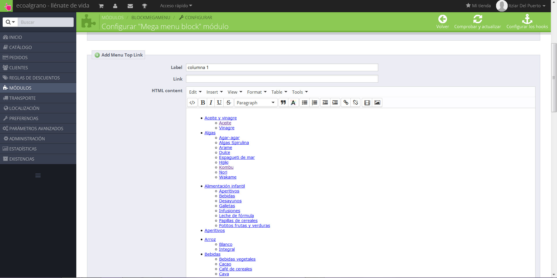 thisis Posted July 2, 2014 Share Posted July 2, 2014 Buenas! A ver si me podeis echar una mano, os explico mis tres errores: 1. No consigo ordenar mi bloque CMS, he conseguido cambiar el orden de los CMS de preferencias>CMS gracias al script que indican aqui http://www.prestashop.com/forums/topic/258216-orden-cms-solucionado/?hl=%2Bcms+%2Borden&do=findComment&comment=1286773 y en 1.6 no funciona bien (hay que clicar varias veces la misma flecha para que suba o baje de posición), tras ordenarlos, no se visualiza el orden en el footer de mi web en la cajita de información y los ordena por ID. 2. Cada vez que añado un producto con el boton de wishlist se me pone la imagen del producto a pantalla completa (adjunto pantallazo) 3. El megamenu solo se me muestra en modo de megamenu creando uno personalizado por lo que tengo que escribirlo todo en HTML con un nombre y un link a a página. (adjunto pantallazo) Espero que alguien me pueda echar una mano porque llevo dias con esto,... Saludos y muchas gracias por anticipado! Link to comment Share on other sites More sharing options...