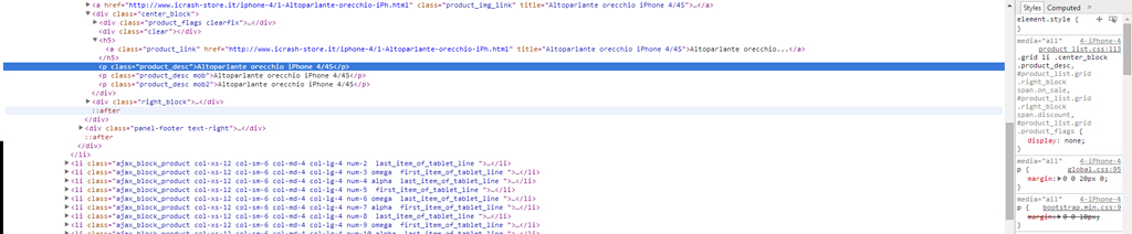 lucascaibe Posted July 3, 2014 Share Posted July 3, 2014 Ciao a tutti, sono nuovo del forum e "semi" nuovo nell'uso di prestashop. Uso prestashop 1.5.6 e ho il seguente problema. Ho abilitato la ricerca AJAX da BO e fin qui tutto ok. Quando però vado a fare una ricerca da FO le descrizioni dei risultati vengono triplicate come vedete nel primo screenshot allegato. Questo succede soltanto se effettuo una ricerca da una pagina diversa da prodotti o categoria. Il problema che riscontro a prima vista è che non viene incluso il foglio di stile product_list.css nel quale vi sono le direttive di stile che nascondono la descrizione di ogni singolo prodotto nella versione desktop del sito. (vedi secondo screenshot del sito) Avete qualche suggerimento? Grazie Link to comment Share on other sites More sharing options...