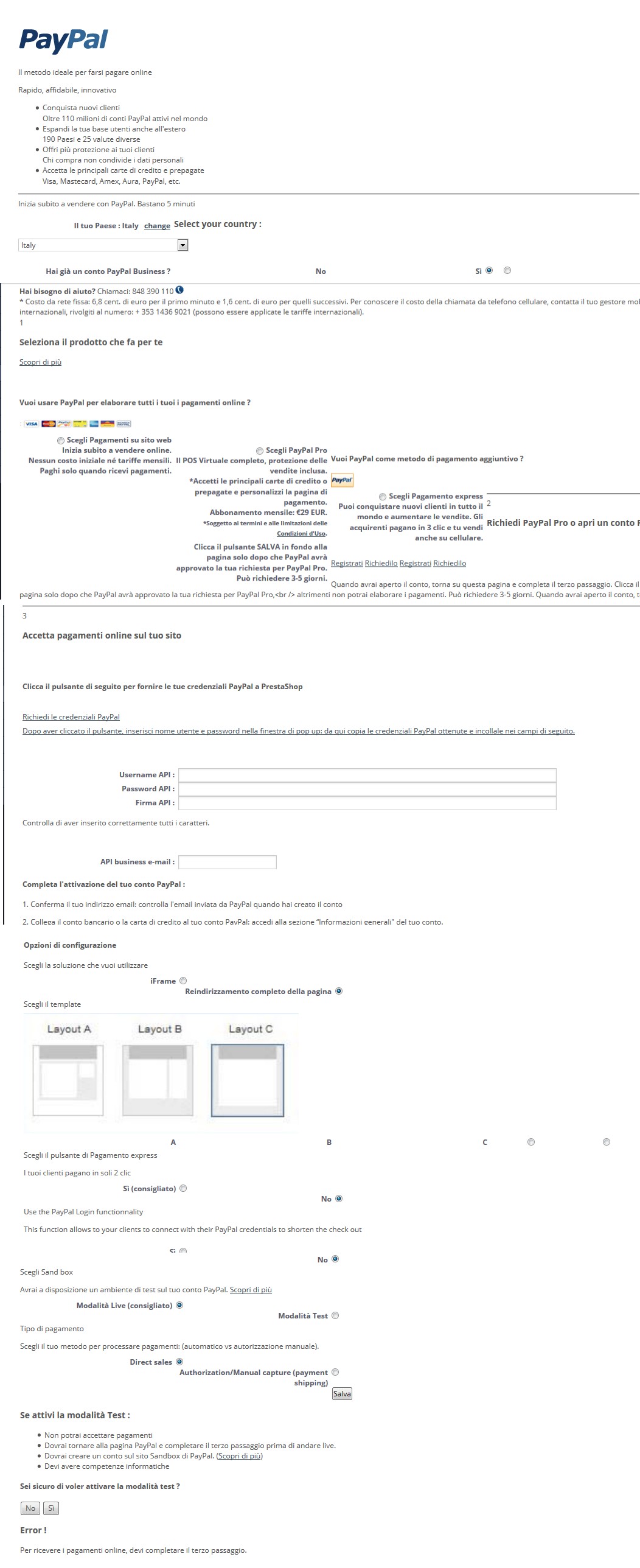 montellam Posted July 3, 2014 Share Posted July 3, 2014 (edited) Sto usando una versione di prestashop nativa 1.6.0.5 e poi aggiornata a 1.6.0.8 con 1-click update. E' incluso il modulo paypal 3.7.1 che a quanto pare la pagina della configurazione mi appare in modo strano. Vi allego le foto. Ecco come deve essere : Provando a disinstallare il modulo paypal e a reinstallarlo mi da questo errore: [PrestaShop] Fatal error in module Language:require_once() [function.require]: Failed opening required '/home/qtfwyoxc/public_html/tools/tar/Archive_Tar.php' (include_path='/home/qtfwyoxc/public_html/tools/htmlpurifier/standalone:.:/usr/lib/php:/usr/local/lib/php') Cliccando poi sul pulsante indietro del browser e aggiornando la pagina me lo da come installato ma la pagina di configurazione è sempre la stessa. Ho provato anche ad installare manualmente il file scaricando il file zip e importarlo nel backend, ma niente, stessa situazione. Provando a compilare tutti i campi in modo corretto e premendo il pulsante salva, mi compare in basso la scritta complimenti è possibile ricevere pagamenti ora e poi subito sotto: ERROR !Per ricevere i pagamenti online, devi completare il terzo passaggio. Edited July 3, 2014 by montellam (see edit history) Link to comment Share on other sites More sharing options...
