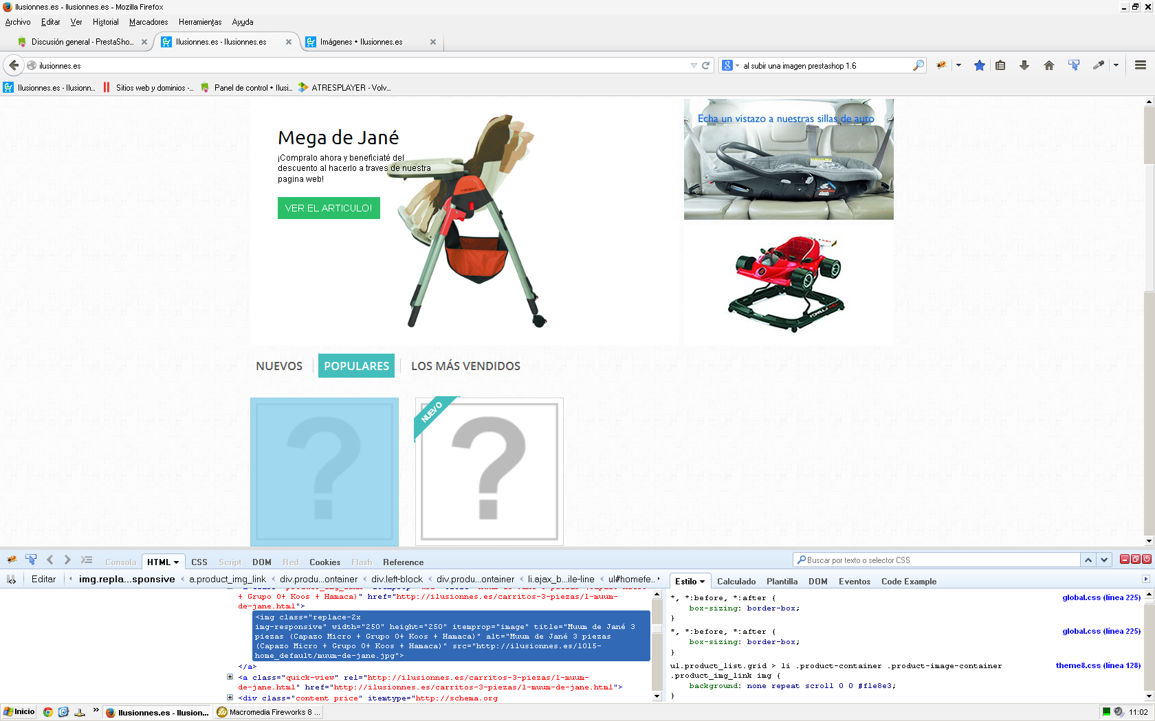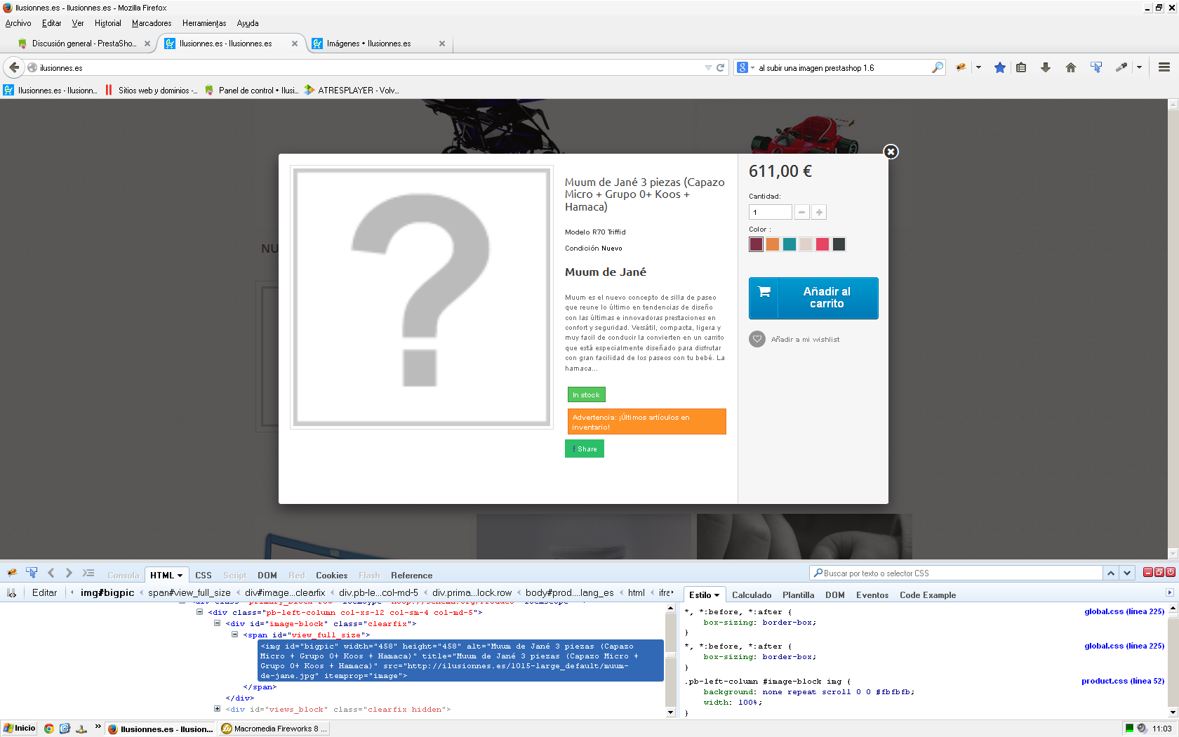 JesusCabezos Posted July 6, 2014 Share Posted July 6, 2014 (edited) Buenas noches, Resulta que estoy modificando antiguos productos y desde hace un rato, las imagenes de los mismos no se ven, ni las miniaturas tampoco. Todo esto ocurre en el front-end. Aparecen las imagenes con un interrogante. Me meto en mi hosting y visualizo el nº de img en la carpeta p y la imagen está perfectamente visible; y en el back office tambien se visualiza perfectamente. Tengo activado el .jpg en imagenes en preferencias y las imagenes son en formato .jpg. he probado a regenerar las miniaturas, pero en varias ocasiones me acaba saliendo un mensaje del firefox diciendo que el tiempo de espera se ha agotado y he tenido que refrescar. El sitio es http://ilusionnes.es Uso la versión prestashop 1.6.0.6 Gracias de antemano por vuestras respuestas. Edited July 6, 2014 by JesusCabezos (see edit history) Link to comment Share on other sites More sharing options...