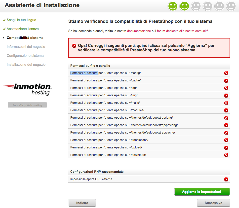 Marcantonio Posted July 9, 2014 Author Share Posted July 9, 2014 Il pannello di controllo lo faccio da admin.masterweb.it il server è di www.widestore.net avevo il dominio qui e ho rinnovato, ma fin ora non c'era nessuna versione di Prestashop. Ho modificato i permessi alle cartelle indicate dando tutte le autorizzazioni anche per la scrittura e sono spariti tutti gli avvisi delle prime voci. Resta soltanto il problema con l'ultimo avviso "Impossibile aprire URL esterne" che non mi consente di completare l'installazione, penso sia questo il problema: https://www.dropbox.com/s/8lzn1gkxz8ywx5i/ps-bloccata.png Sapresti dirmi come procedere per ultimare l'operazione di installazione? Grazie Marcantonio Link to comment Share on other sites More sharing options...