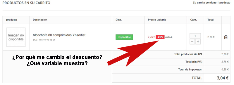 Y es que me varía el descuento de la ficha del producto, cuando abro el carrito de la compra. Me varía sólo el dato que muestra, porque el descuento lo hace perfectamente, por lo que creo debe ser que no muestra la variable correspondiente,