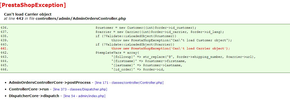 Klemart3D Posted August 18, 2016 Share Posted August 18, 2016 Same problem here, with Prestashop 1.6.0.13 : [PrestaShopException] Can't load Carrier object at line 475 in file controllers/admin/AdminOrdersController.php 470. $customer = new Customer((int)$order->id_customer);471. $carrier = new Carrier((int)$order->id_carrier, $order->id_lang); 472. if (!Validate::isLoadedObject($customer)) 473. throw new PrestaShopException('Can\'t load Customer object'); 474. if (!Validate::isLoadedObject($carrier)) 475. throw new PrestaShopException('Can\'t load Carrier object'); 476. $templateVars = array( 477. '{followup}' => str_replace('@', $order->shipping_number, $carrier->url), 478. '{firstname}' => $customer->firstname, 479. '{lastname}' => $customer->lastname, 480. '{id_order}' => $order->id, AdminOrdersControllerCore->postProcess - [line 171 - classes/controller/Controller.php] ControllerCore->run - [line 373 - classes/Dispatcher.php] DispatcherCore->dispatch - [line 54 - admin/index.php] Link to comment Share on other sites More sharing options...
