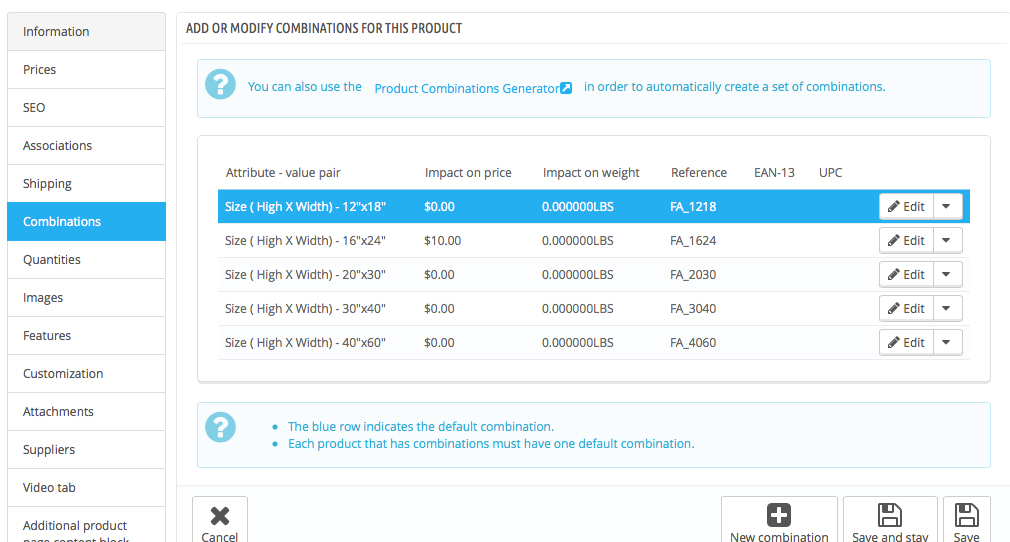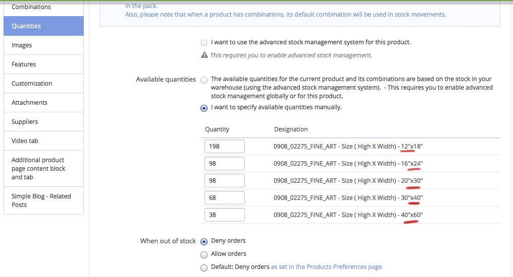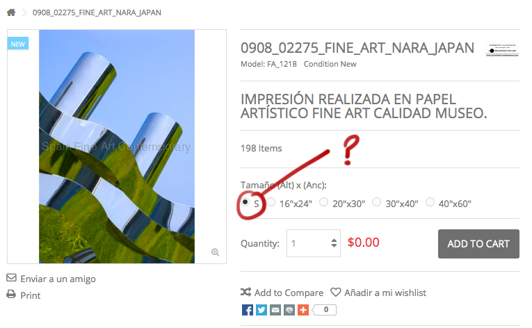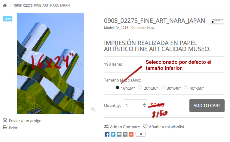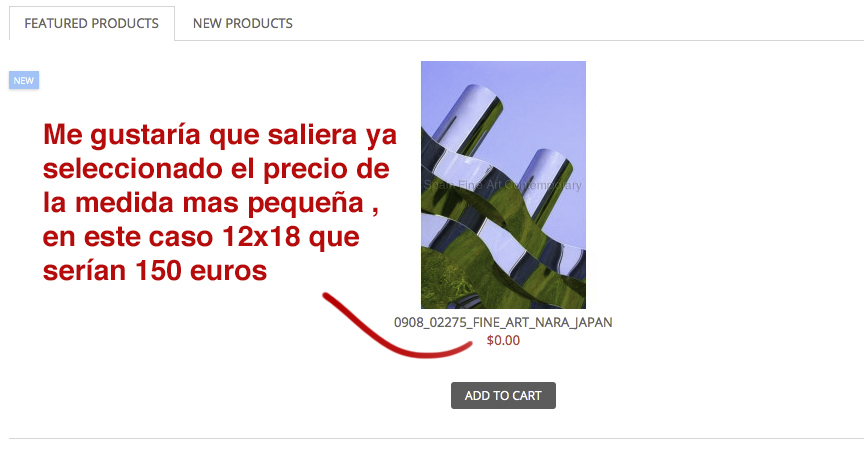 robertomanrique Posted July 14, 2014 Share Posted July 14, 2014 Hola, os dejo mi primera duda. Gracias por vuestro tiempo en contestar. PrestaShop™ 1.6.0.8 Thema: Warehouse version 3.2 Deseo : poner a la venta una misma fotografía pero en varias medidas. Y que aparezca la imagen de la obra fotográfica que quiero vender con el precio de la medida mas pequeña (por ejemplo) Y que al pulsar sobre la imagen pueda seleccionar cualquiera de las 5 medidas que en este caso tengo. Proceso que he seguido: 1- Doy de alta el producto (subo la imagen) 2- En el precio del producto pongo 0 (cero) ya que se ha de seleccionar despues la medida deseada. 3- Introduzco las combinaciones de las medidas que voy a vender de cada imagen. En esta caso quiero vender 5 medidas 4- Introduzco las cantidades máximas que voy a vender por cada medida ya que son series limitadas. Lo que me aparece y no me gusta : Al pulsar sobre la imagen me aparece seleccionada una "s" (por defecto) y me gustaría que estubiera marcada ya por defecto la primera medida (16x24). El resto ok ya que al seleccionar un tamaño, me cambia el importe. (Os pongo al final lo que yo quisiera que me apareciera a mano alzada) Mi deseo: Gracias. Si necesitais algún pantallazo que no he puesto y lo necesitáis me lo comentáis. O que os amplie alguna cosa que no ha quedado clara. _____________ Link to comment Share on other sites More sharing options...