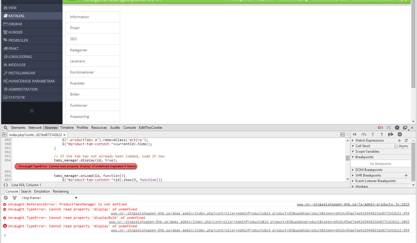 after updating to Prestashop to 1.6, I can no longer edit products. The information tab initially comes up, but choosing any tab after that gives javascript error: