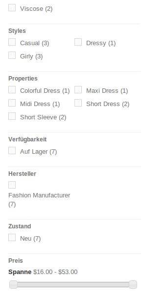 Mahaba Posted July 18, 2014 Share Posted July 18, 2014 (edited) Moin zusammen, die nächste Newbie-Frage: In der Grundinstallation mit den Demodaten kann man in der jeweiligen Kategorie die angezeigten Produkte nach verschiedenen Merkmalen einschränken, außerdem hat man Schieberegler zur Einschränkung des gewünschten Preisbereiches. Wie kann ich diesen Block anzeigen? Danke! Edit: Natürlich habe ich Artikel mit entsprechenden Eigenschaften angelegt :-) Edited July 18, 2014 by Mahaba (see edit history) Link to comment Share on other sites More sharing options...