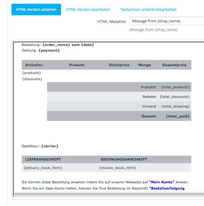 blumfriz1 Posted July 18, 2014 Author Share Posted July 18, 2014 Nach 10 Stunden Googlen und Herumprobieren... für alle, die das gleiche Problem haben...bei mir hat folgendes funktioniert: order_conf_product_list.tpl und order_conf_product_list.txt müssen manuell in den Ordner mails/de und alle weiteren Sprachenordner (mails/gb etc.) kopiert werden. Das gleiche dann nochmal im mails-Ordner des Templates. Danach ging's bei mir. Geholfen hat mir auch diese Seite --->http://forge.prestashop.com/browse/PSCSX-2450 Allerdings hat das Ändern in z.B. "{products_txt}" zu einer unformatierten Artikelzeile geführt, weshalb ich es wieder rückgängig gemacht habe. 2 Link to comment Share on other sites More sharing options...