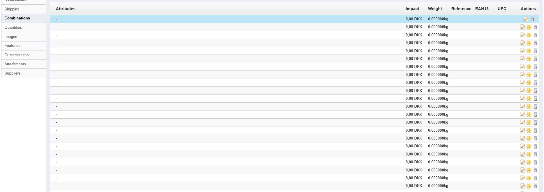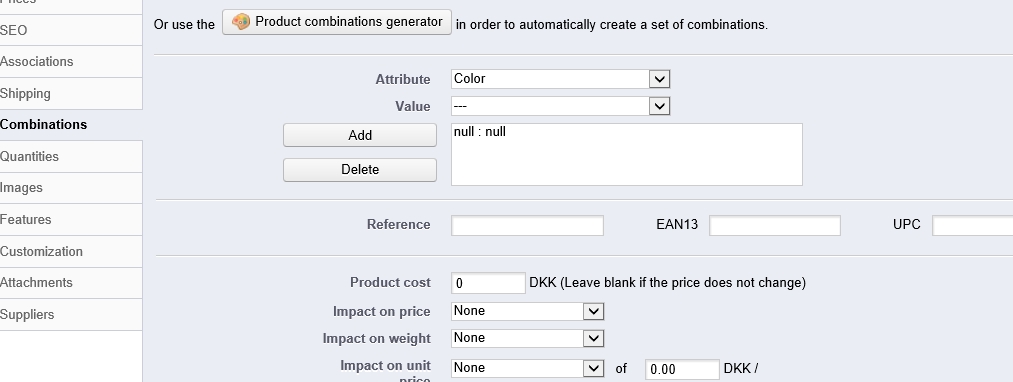Roks Posted July 18, 2014 Share Posted July 18, 2014 All attributes of combinations that were set to products are empty. Inside combination instead of Color :Black it shows Null :Null but all values exist in selectbox Its on PrestaShop™ 1.5.6.2 Why does it happened? Attributes were not deleted or changed. Is it possible to restore it somehow, is it possible to automatically generate combinations of all possible values for particular category of products? Link to comment Share on other sites More sharing options...