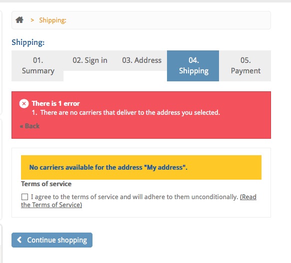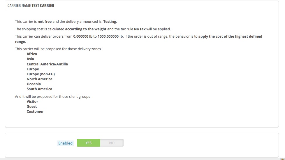 bgood3354 Posted July 21, 2014 Share Posted July 21, 2014 I am using PS 1.6.0.8. I have not been able to get carriers assigned to domestic (USA) orders even though I installed USPS and UPS modules so tried this test. 1. Turned on all Zones. 2. Turned on several different countries. 3. Confirmed that US has States turned on. 4. Confirmed that the states involved in my test are Enabled. 5. Disabled all current carriers and created a new custom "Test Carrier" and set parameters so that "Test Carrier" could ship any box under 1000 pounds to anywhere in the world for $10. See attached screen grabs. 6. I changed the Default Carrier to "Test Carrier" 7. Created a new test user with an address in the same state as my store and place an item (shipping weight = 1 pound) into shopping cart and proceeded to checkout. As you can see from the attached I still get a "No Carrier" message. Is there any way to fix this short of deleting my entire store and starting over? Thanks, Bob Link to comment Share on other sites More sharing options...