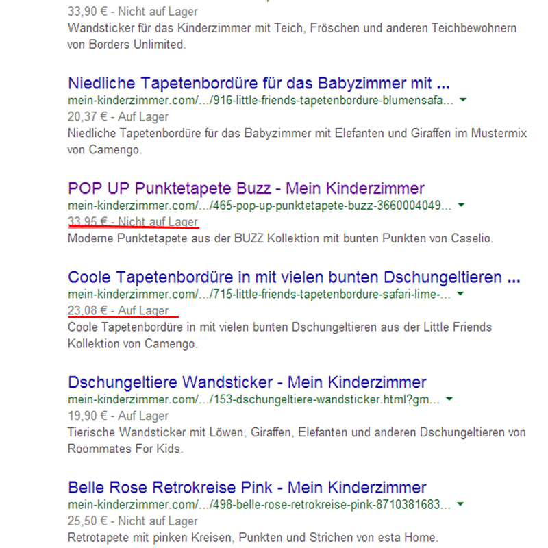 silv Posted July 25, 2014 Author Share Posted July 25, 2014 Hallo Silv, die Details deiner Anzeigen bei Google werden über microdata (RichSnippets) gesteuert, der code der die Verfügbarkeitsanzeigen erzeugt sieht in deinen html-Dateien so aus: <link itemprop="availability" href="http://schema.org/InStock"> bzw <link itemprop="availability" href="http://schema.org/OutOfStock"> Erzeugt werden diese Zeilen vermutlich in der Datei: /themes/Tokyo/product.tpl Dort müsstest du im Quelltext mal suchen ganz in der Nähe vom "Preis" und den entspr. Code herausnehmen (oder wenn du es nicht findest mir deine FTP- und Shop-Admin-Daten über PM zukommen lassen.) [OFF TOPIC] Selbstverständlich kann es keine rechtlichen Probleme geben wenn du in einer werbenden Ansicht zu deinen Produkten Preisangaben ohne die Angaben zur Mwst u. zu den Versandkosten machst. Wie du richtig angemerkt hast machen das die "Grossen" Zalandos und Neckermanns auch so. Der grosse Unterschied in deinen Übersichtsseiten ist aber, dass man bei dir direkt aus dieser Übersicht die Waren in den Warenkorb legen kann, und da - wenn du dir mal die Mühe machst die einschlägigen Urteile durchzulesen - verlangen die allermeisten Gerichte, dass in diesem Moment Preisklarheit herrscht, d.h. in unmittelbarer Nähe zum Preis auch die Angaben zur Mwst und zu den Versandkosten sichtbar sind. Das einfachste wäre wenn du im Backoffice die Funktion für den Einkauf aus der Übersicht einfach abschaltest, zumal das ja z.B. bei der Tapete sowieso nicht soviel Sinn macht den Artikel in den warenkorb zu werfen ohne vorher die Anzahl bestimmt zu haben. Grüsse Whiley Danke Whiley, das war genau der Ansatz, den ich gebraucht habe . Ich habe es im product.tpl auskommentiert und die nächsten Tage werden zeigen, ob ich es richtig gemacht habe. Was das OFF Topic anbelangt, war auch der Hinweis mit dem Warenkorb sehr hilfreich, da hier die große Änderung bei uns war, ich setz es sofort auf die TO DO Liste für den Freelancer, da kommt hier halt wie im alten Shop wieder der Link zum Produkt und nicht in den Warenkorb hin. Vielen Dank nochmals. Silv Link to comment Share on other sites More sharing options...