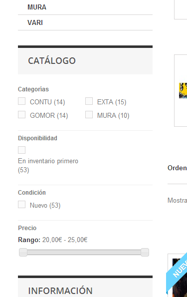 rafaelamargo Posted July 24, 2014 Share Posted July 24, 2014 Estoy haciendo una web con prestashop 1.6.0.8 Mi problema es que deseo quitar unas opciones de busqueda que me salen en la parte izquierda, bajo el titulo "catalogo" y que me dan la opcion de filtrar la busqueda. Deseo quitarlo y no se como GRACIAS Es un modulo que se llama: navegación por facetas lo puedes encontrar en la pestaña módulos -> módulos del panel de administración de tu tienda. 1 Link to comment Share on other sites More sharing options...