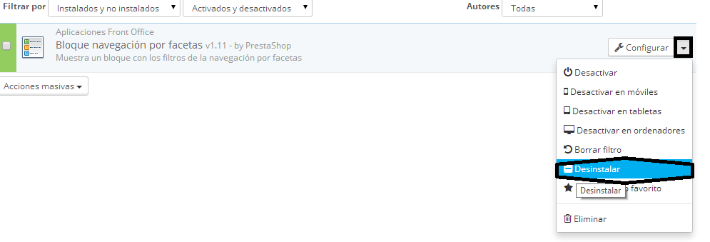 rafaelamargo Posted July 24, 2014 Share Posted July 24, 2014 muchas gracias por la respuesta, lo malo es que me obliga a dejar al menos un filtro...si se pudiera eliminar por completo seria genial. Lo puedes desinstalar sin problema, cuando estas en el listado de modulos en la pestaña modulos -> modulos y estas viendo el nombre del modulo en cuestión veras una opción que dice configurar y al lado flecha para abajo, si pulsas esa flecha, te saldran distintas opciones, entre ellas una que se llama: Desinstalar Te he adjuntado una imagen, en el mensaje, para que veas a que me refiero. 1 Link to comment Share on other sites More sharing options...