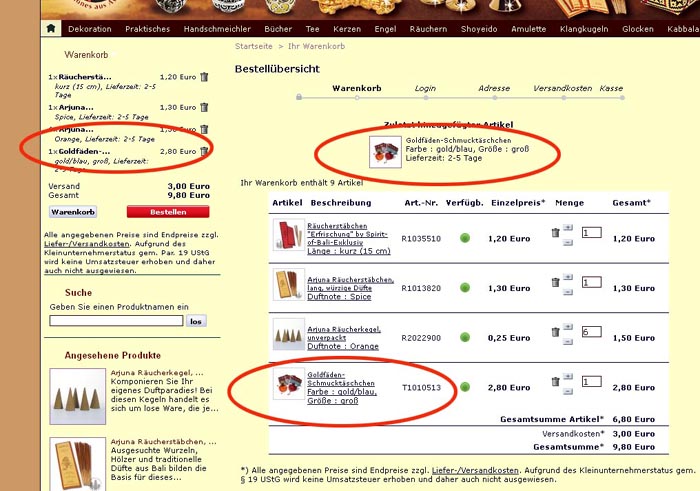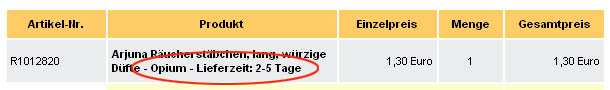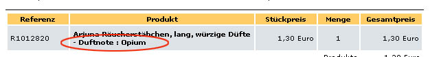 Frau_Inga Posted August 5, 2014 Author Share Posted August 5, 2014 (edited) Hallo Luca01, danke für den Hinweis. Ich hab's lösen können, wenn auch nicht optimal. Wie bekomme ich es hin, dass die Angabe "Lieferzeit: 2-5 Tage" ein editierbares Feld wird (in den Übersetzungen)? Alles, was ich probiert habe, ist gescheitert. <td style="padding: 0.6em 0.4em;"><strong>'.$product['name'].(isset($product['attributes_small']) ? ' - '.$product['attributes_small'] : '').' - Lieferzeit: 2-5 Tage</strong></td> Dann ist mir noch eine Ungereimtheit zwischen der order_conf und der Bestätigung, die ich bekomme aufgefallen: In der Bestellbestätigung, die ich bekomme heißt es z. B. "Duftnote: Opium" In der Bestellbestätigung, die mein Kunde bekommt, heißt es z. B. "Opium - Lieferzeit: 2-5 Tage" (siehe attachements) Hast du dazu irgendeine Idee? Ist nicht so wichtig, aber ich löse Probleme gerne, wenn sie da sind. Meine Version ist 1.4.4.1 Danke und viele Grüße Inga Edited August 5, 2014 by Frau_Inga (see edit history) Link to comment Share on other sites More sharing options...