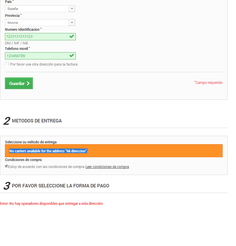 sergiopangea Posted July 29, 2014 Share Posted July 29, 2014 Hola He instalado por primera vez un Prestashop 1.6 en español y cuando voy a hacer un pedido rapido al darle a guardar dirección de entrega me sale en metodos de entrega el mensaje No carriers available for the address "Mi direccion". Lo podeis ver en la imagen adjunta. tengo ya puesto solo un transportista por defecto y pensaba que con eso debería aparecer. Por favor me podeis ayudar con esto ? Gracias Link to comment Share on other sites More sharing options...