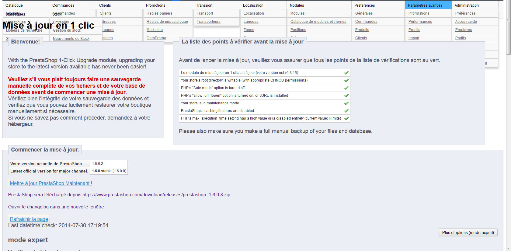 Shido Posted October 21, 2014 Share Posted October 21, 2014 (edited) Bonjour, Je me permets de remonter ce topic car je suis dans le même cas. Mon site fonctionne parfaitement en local sous Wampserver, j'ai désactivé les modules non développé par Prestashop, mis la boutique en maintenance et lors du lancement de la mise à jour en 1 clic, la sauvegarde des fichiers bloque peu après le lancement et toujours au même endroit. img\c\index.php added to archive. 11846 files left. La liste des points à vérifier avant la mise à jour est complètement verte. Si quelqu'un aurait déjà eu ce soucis ou une solution au problème ? Merci Edited October 21, 2014 by Shido (see edit history) Link to comment Share on other sites More sharing options...