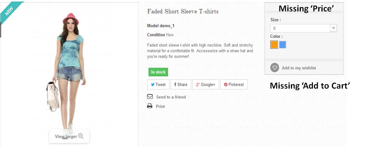 ginoshear Posted July 31, 2014 Share Posted July 31, 2014 Hi there, the 'pricing' and 'add to cart' display have disappeared from my front office after I created a product combination. Attached is the printscreen of a test product. Anyone knows how to resolve this problem? Link to comment Share on other sites More sharing options...
