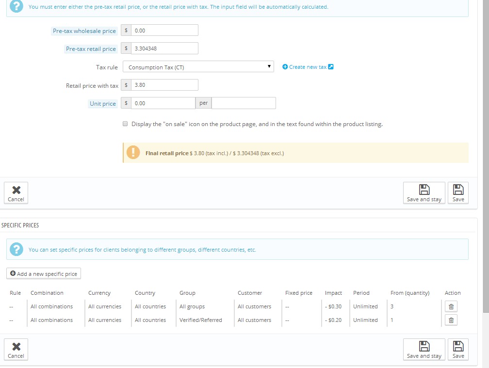 benjamin utterback Posted August 4, 2014 Share Posted August 4, 2014 Testing PS1.6.0.9 on local wamp server and found the following: Volume discount "you save" column not displayed right in the front office. More details about my example: 1. I've created different customer groups with different prices. 2. Retail price for the product is 3.80 3. For one group (verified/referred member), the price is 3.60 (0.20 discount) 4. For anyone who buy over 3, the price is 3.50 (0.30 discount). You see the attached pic, the volume discount, you save should be 0.30, while it shows 0.32 Attached pics for reference. bo.jpgfo.jpg In PrestaShop The discount is placed after the tax. This is something that we are working on, optimizing and correcting the way tax+discounts work together. You could test the product having no tax and let us know if it works as expecting. Link to comment Share on other sites More sharing options...