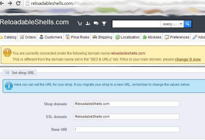 kerrianne42 Posted August 6, 2014 Share Posted August 6, 2014 I've recently updated a site and when I finished and set up the SEO & URLs tab / page to reflect the name of the site, PS started having hiccups or something. See the images for screenshots for support (I've posted here before and understand the immediate consideration that I'm illiterate and have a functional IQ of 3 when I ask a question that others will tell me "can't happen") I am logging in to the backend of ReloadableShells.com This is the same base URL for the front end. When I log in to back office I am greeted with a message telling me, "You are currently connected under the following domain name reloadableshells.com This is different from the domain name set in the "SEO & URLs" tab. If this is your main domain, please change it now." I click the link and see that I am still literate and that the SEO & URLs page says "ReloadableShells.com" So, how do I convince Prestashop to stop putting this incorrect message up on back office?? Thanks. Link to comment Share on other sites More sharing options...