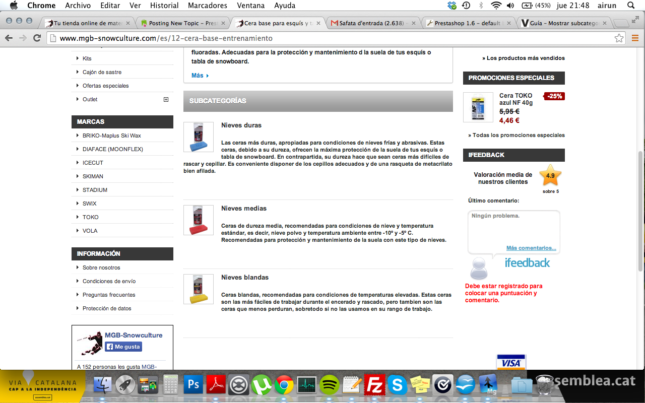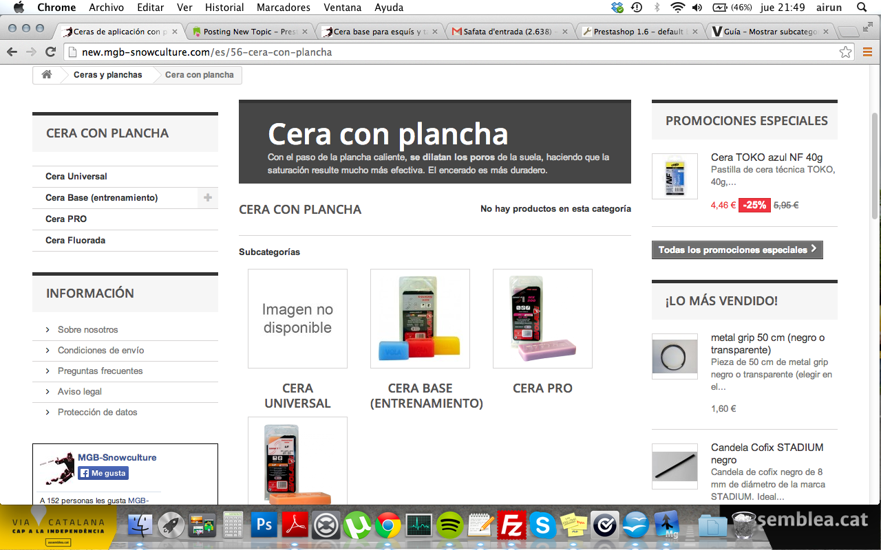 oriolgoula Posted August 7, 2014 Share Posted August 7, 2014 (edited) Hola de nuevo, Voy batallando y cada vez me acerco más: new.mgb.snowculture.com . El caso es que me gusta la distribución de las categorías en formato lista como en la versión 1.5 y veo que la 1.6 es tipo parrilla, por defecto. He estado buscando y quiero hacer justo al revés de lo que propone nadie en este post (versión 1.5) http://victor-rodenas.com/2013/02/16/guia-mostrar-subcategorias-en-grid-cuadricula-en-prestashop-1-5/#more-4271 He intentado cambiar el archivo que propone en el post de forma inversa pero todo ha cambiado batante en el category.css y las líneas no están como él comenta. ¿Alguien puede indicarme modificar el category.css para volver a la visualización tipo lista? Mil gracias por vuestro tiempo y ayuda, un saludo, Oriol pd: adjunto foto de como me gustaría tener las categorías (la primera) y como están ahora (segunda) Edited August 7, 2014 by oriolgoula (see edit history) Link to comment Share on other sites More sharing options...