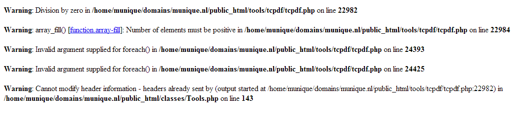 niels194 Posted August 10, 2014 Share Posted August 10, 2014 Hello everyone, I'm getting the error stated below, when i change a state to: 'Payment accepted' Warning: Division by zero in /home/munique/domains/munique.nl/public_html/tools/tcpdf/tcpdf.php on line 22982 Warning: array_fill() [function.array-fill]: Number of elements must be positive in /home/munique/domains/munique.nl/public_html/tools/tcpdf/tcpdf.php on line 22984 Warning: Invalid argument supplied for foreach() in /home/munique/domains/munique.nl/public_html/tools/tcpdf/tcpdf.php on line 24393 Warning: Invalid argument supplied for foreach() in /home/munique/domains/munique.nl/public_html/tools/tcpdf/tcpdf.php on line 24425 Warning: Cannot modify header information - headers already sent by (output started at /home/munique/domains/munique.nl/public_html/tools/tcpdf/tcpdf.php:22982) in /home/munique/domains/munique.nl/public_html/classes/Tools.php on line 143 I think this is caused by the generation of the invoice. The invoice also has an error and is inclompleet Warning: mb_split() [function.mb-split]: Empty regular expression in /home/munique/domains/munique.nl/public_html/tools/smarty/plu gins/shared.mb_str_replace.php on line 47 Does anybody have an idea what this could be? Link to comment Share on other sites More sharing options...