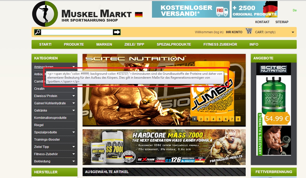 Santori Posted August 10, 2014 Share Posted August 10, 2014 Hola amigos! Acabo de terminar mi tienda en prestashop 1.5.. Acabo de darme cuenta de un error que no me pasa en la plantilla default y que no se como solucionar. Cuando pones el raton sobre el bloque lateral de categorias te sale um cuadro con la descripcion de la misma, pero en mi tema me sale con el contenido en html y se me ve todo el codigo... Alguien sabe como solucionar esto? gracias de antemano chicos.. Dejo la url: www.muskelmarkt.de Link to comment Share on other sites More sharing options...