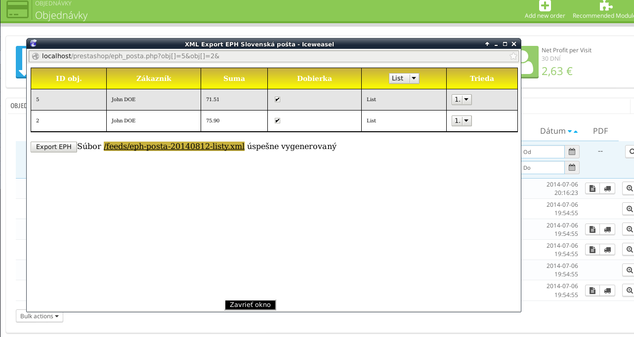 frajdy Posted August 12, 2014 Share Posted August 12, 2014 (edited) Vytvoril som skript, ktorý umožňuje export xml vybraných objednávok z administrácie. Postup pre inštaláciu: AdminOrdersController.php -> /override/controllers/admin/ eph_posta.php -> hlavný priečinok, kde máte nainštalovaný ps eph_posta.css -> /css/ vymažte /cache/class_index.php vytvorte priečinok /feeds/ Nič sa neprepisuje, takže to váš systém neovplyvní, jedineAdminOrdersController.php sa dáva do override priečinka, čiže načíta sa tento kontroler, namiesto pôvodného. Ak ho už máte upravovaný tak len dopíšte, čo tam nie je. v súbore eph_posta.php si upravte odosielateľa namiesto XXX doplnte vaše údaje (riadok 95-103) V prípade otázok, pripomienok na vylepšenie, neváhajte a vyjadrite sa. Robil som to vo svojom voľnom čase, a zabralo mi to celkom dosť času. Ak sa vám skript páči a bude pre Vás užitočný, ušetrí čas aj peniaze (bežne 25€ stojí takýto modul), poteší akýkoľvek finančný príspevok -> 2295460854/0200 eph_posta.php eph_posta.css AdminOrdersController.php Edited August 13, 2014 by frajdy (see edit history) 5 Link to comment Share on other sites More sharing options...