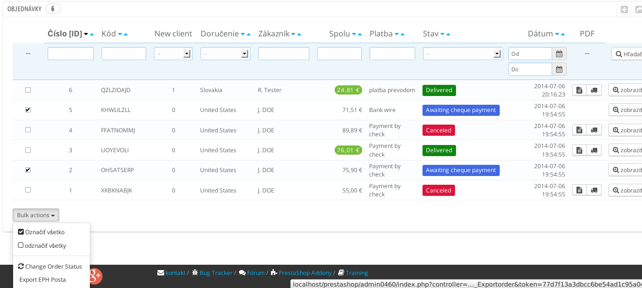 frajdy Posted August 22, 2014 Author Share Posted August 22, 2014 no každopádne pri novej inštalácii by bulk actions mali ist bez problémov .. slúži na to AdminOrdersController.php, kontrétne funkcie public function renderList(){ if (Tools::isSubmit('submitBulkupdateOrderStatus'.$this->table)) .... } public function processBulkUpdateOrderStatus() Môžete vyskúšať AdminOrdersController.php, do ktorého som doplnil aj ephExport a uvidíte, či to niečo spraví, tj. postupujte podľa inštrukcií na inštaláciu v prvom príspevku. Link to comment Share on other sites More sharing options...