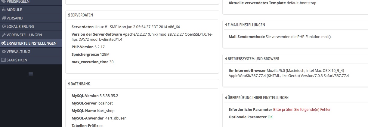 kulli Posted August 14, 2014 Share Posted August 14, 2014 welcher provider? Erweiterte einstellungen - Systemeinstellungen Serverdaten die daten musst Du aber auf Deinem Server auch selbst auslesen können, und es giebt noch eine kleine php-datei zum hochladen in denen Du per broser-Aufruf der Datei die php-daten sehen kansst, google doch mal: php einstellungen auslesen Link to comment Share on other sites More sharing options...