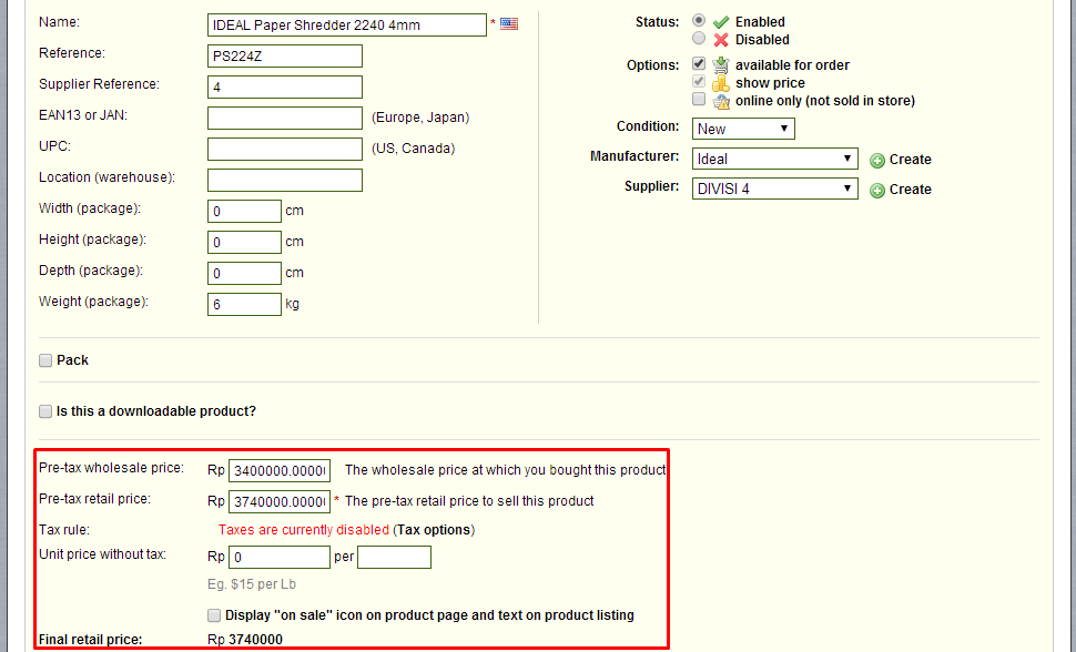 baltazhor Posted August 14, 2014 Share Posted August 14, 2014 (edited) Hallo Semua, pertama saya sangat amat newbie dalam dunia per-prestashop-an. jadi mohon bimbingan dan bantuan dari rekan semua yang sudah lebih dulu kenyang dengan asam garam prestashop saya ada masalah dengan tampilan informasi produk prestashop saya (lihat attachment). awalnya saya export data product ke dalam csv file dan update harga beberapa produk. Masalahnya adalah ketika saya impor kembali ke dalam prestashop dan cek ke halaman frontpage, harga produk saya bertambah tinggi (walaupun hanya beberapa poin) namun sangat mengganggu. contoh saya input harga (Screenshot_1.png) dengan harga final menjadi 3,740,000. Namun ketika saya cek di halaman front page harganya menjadi 3,740,006 dan dengan tambah informasi "INCLUDE RP 6 FOR GREEN TAX" (Screenshot_2.png). bagaimana cara untuk memperbaikinya ? saya menggunakan prestahop versi 1.4.3 Mohon bantuan dari rekan-rekan sekalian. untuk bantuannya saya ucapkan banyak terimakasih Edited August 14, 2014 by baltazhor (see edit history) Link to comment Share on other sites More sharing options...