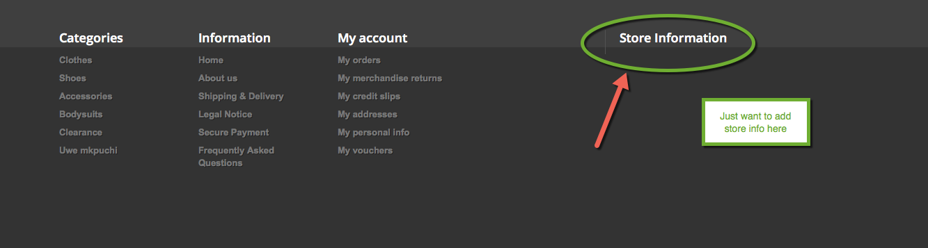 Sandeep Tiwari Posted August 16, 2014 Share Posted August 16, 2014 For footer store information , go to modules and search for contact information block module ,save your information and then you will see the results on footer. for the header part , there must be modules like contact ,language are hooked twice in displaytop block. Check this under positions : modules -> postions then displaytop ... Screenshot for footer : http://awesomescreenshot.com/0f23bn9nc9 Screenshot for header issue : http://awesomescreenshot.com/03a3bn9x64 Sandeep Link to comment Share on other sites More sharing options...