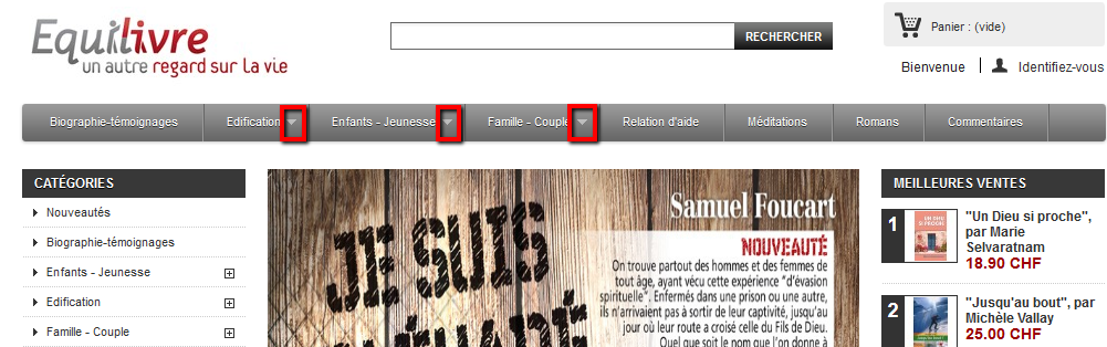 frank_jarle Posted August 17, 2014 Share Posted August 17, 2014 @Vekia: I know what he mean, if you look at the picture he want top menu to have arrows that points down on his site. Look at his website http://www.librairie-eauvive.ch/ : Now look at the site he refer to http://librairie-chretienne.ch/ : So basically he wants down-pointing arrows to show up on top meny where it has sub-categories, to indicate it has more to choose from. Mr myselfidem, am i correct in my assumption? I hope someone can help out on this. Link to comment Share on other sites More sharing options...