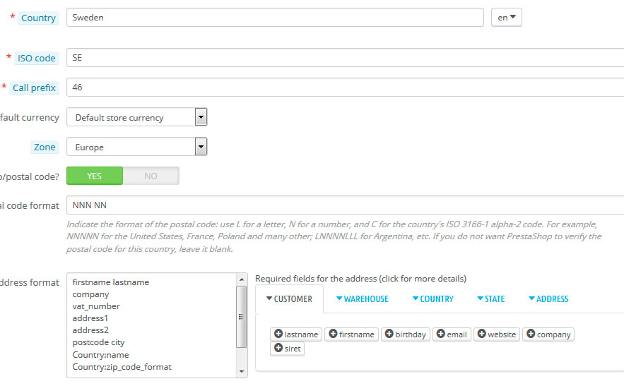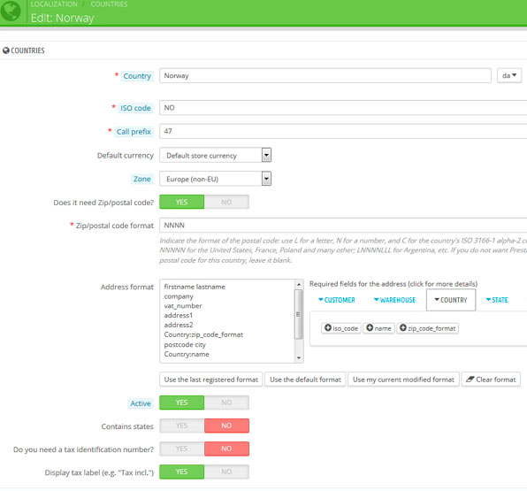 Kim Maarup Posted August 19, 2014 Author Share Posted August 19, 2014 best so show bo--localization--countries--edit country this shows the format of that country zip Hi. I´m not quite sure .... Would you like screenshots from somewhere else? I attach a new: Localization / countries / edit country with the tab on Country (Norway) Here you see the format of Zip -- 4 digits) On the previous screenshot you see Sweden format xxx xx They both are correct format, but.. does not work from the respective countries. Link to comment Share on other sites More sharing options...