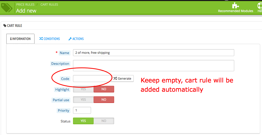 - DON'T Fill in a code, to make the cart rule be added automatically