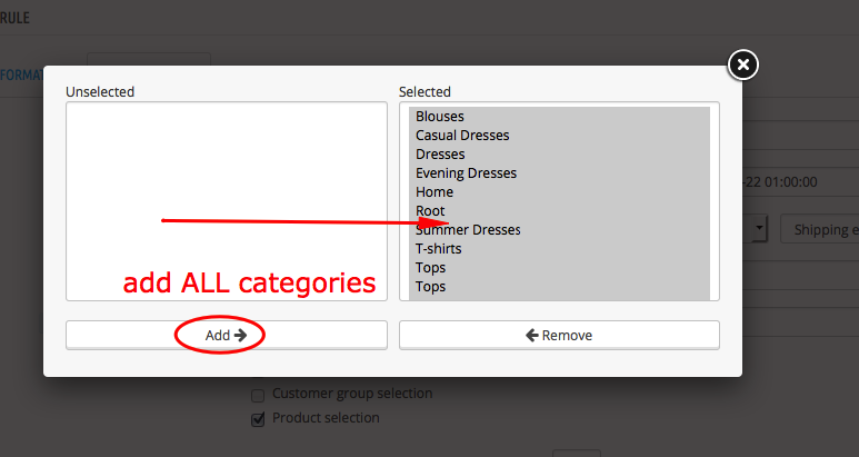 - in the pop up, select ALL categories and Add them (they move to the right column)