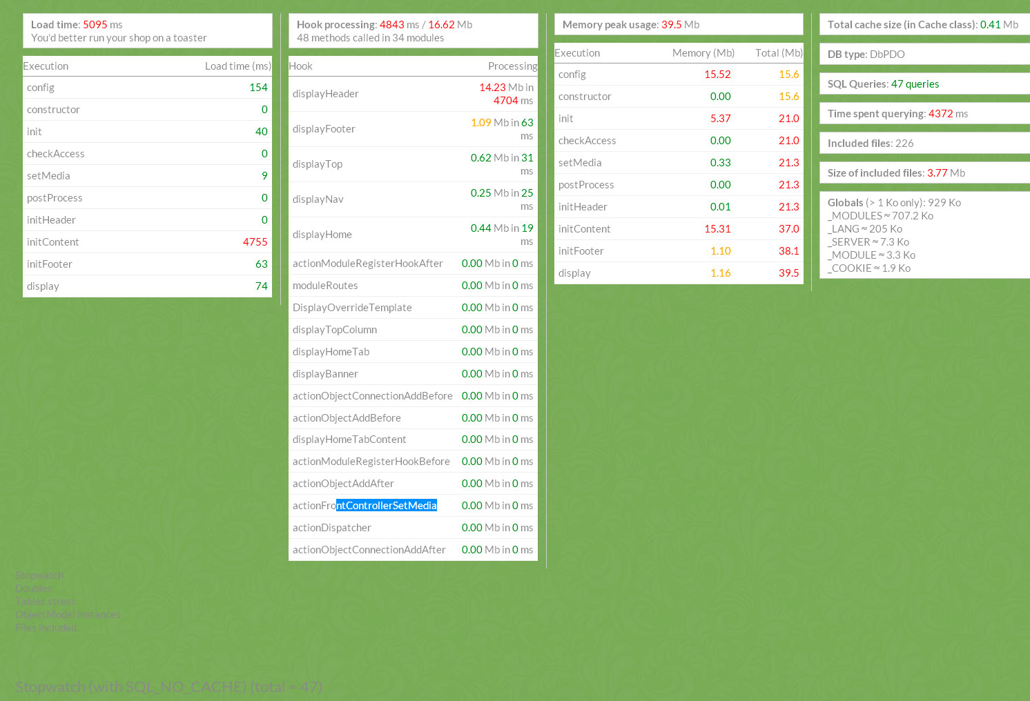 nicola82 Posted August 25, 2014 Share Posted August 25, 2014 Ciao! oramai sono quasi alla fine dell'upgrade a presta 1.6.0.8 (arrivo da 1.4.5). Provando la nuova versione sullo stesso hosting dove è ospitata la vecchia ho notato che è molto molto piu' lenta rispetto alla vecchia. Siamo d'accordo che l'hosting base aruba non è ottimizzato per prestashop, però col vecchio 1.4 non avevo nessun problema di velocità. I casi sono due: 1) o l'hosting è la totale causa della scarsa velocità 2) o c'è qualche errore di impostazione nel negozio Nel primo caso cambierei cmq il pacchetto di hosting, magari rimanendo su aruba su un server semidedicato e magari con un sistema di gestione cache. Nel secondo caso chiedo aiuto a voi su quale potrebbe essere il problema, vi allego uno screenshot di debug dell homepage. grazie! Link to comment Share on other sites More sharing options...