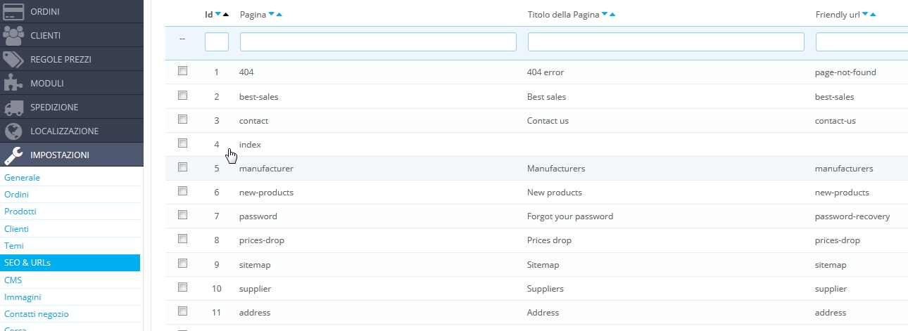 skara Posted August 29, 2014 Author Share Posted August 29, 2014 (edited) ciao Skara si sinceramente (almeno io sono un pò cotto) non ho capito niente, hai attivato url in seo ? cosa hai fatto ? ciao Skara si sinceramente (almeno io sono un pò cotto) non ho capito niente, hai attivato url in seo ? cosa hai fatto ? Cerco di spiegarmi meglio: ho acceduto alla pagina in prestashop di figura. Con un click su qualsiasi pagina listata (ad esempio index dove c'è la manina nella figura), si apre in Firefox una pagina bianca ed in IE "pagina non trovata": Spero di essermi spiegato meglio, in caso non farti scrupoli a chiedermi di rispiegarmi meglio. Ti ringrazio intanto dell'attenzione e per qualsiasi suggerimento. Il mio scopo finale è quello di inserire il title e metatag sulle pagine del sito e ho letto da qualche parte che si fa proprio accedendo a "index" di figura. Ciao. Edited August 29, 2014 by skara (see edit history) Link to comment Share on other sites More sharing options...