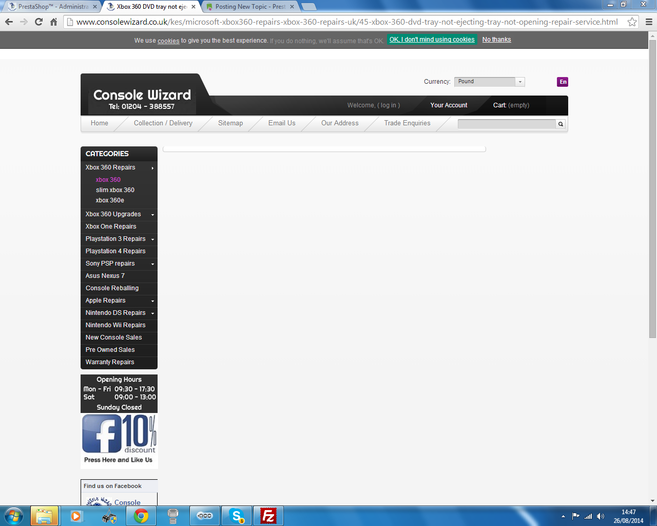 ScooterCk Posted August 26, 2014 Share Posted August 26, 2014 Hi, Can somebody please help me with my website. (www.consolewizard.co.uk) My website has been running now for over twelve months and working fine, until today. Everything appears okay, but when you go to a category, this displays okay, but then if you select any product, rather than open the product description, the screen is just blank?? I have restored a backup SQL from a few days ago and its exactly the same, does anybody have any ideas on what the problem is and how I can fix it ?? Please help - This is urgent as my site is down Respect Scooterck Link to comment Share on other sites More sharing options...