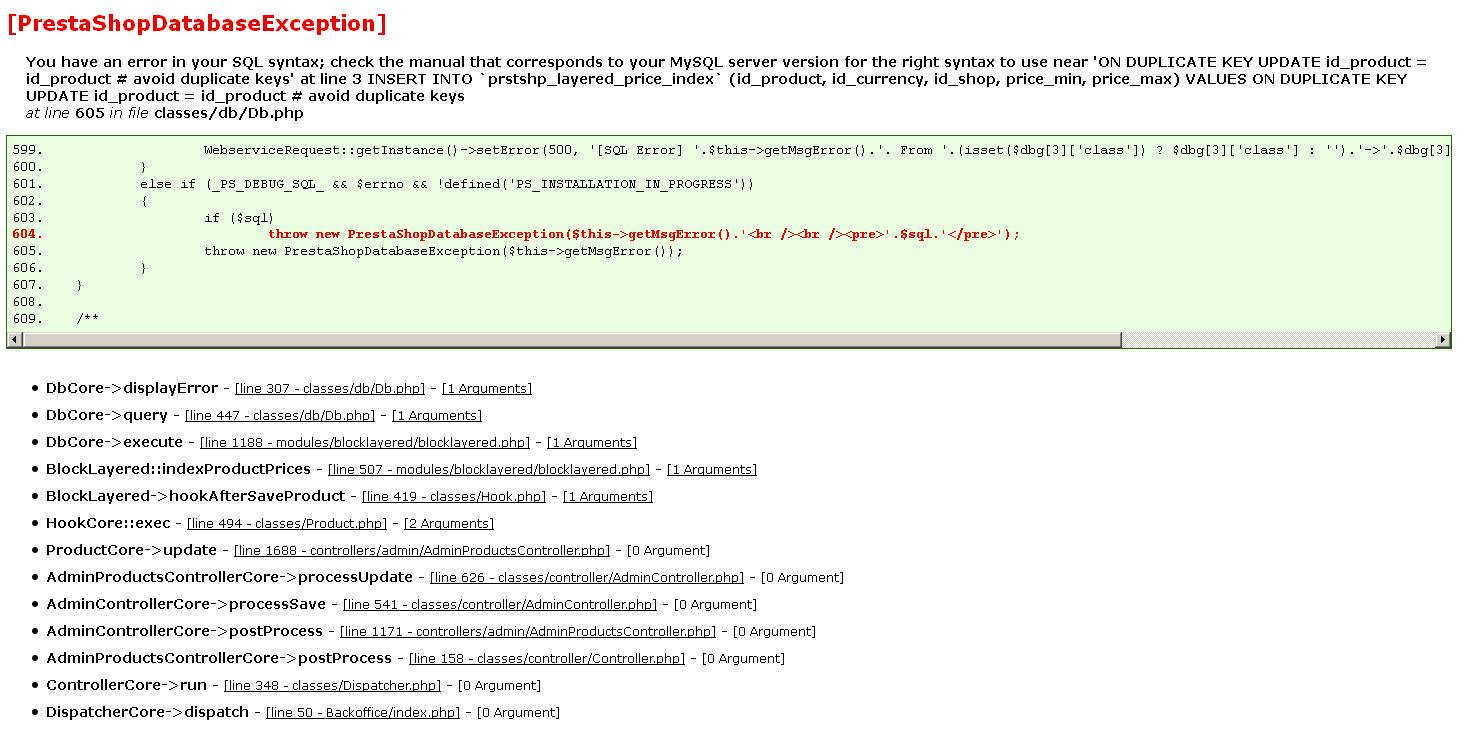 cor frelink Posted August 26, 2014 Share Posted August 26, 2014 Ik heb een webwinkel. Ik probeerde zeer recentelijk een item toe te voegen, maar dit geeft het volgende probleem. Komt ook voor als ik een product wil aanpassen. bijvoorbeeld de prijs. Ik heb verder geen tussentijdse wijzingingen en de hosting provider geeft niet thuis. Wie weet hopelijk wat te doen? Ik heb versie PrestaShop™ 1.5.3.1 De website is branda.nl PrestaShopDatabaseException]You have an error in your SQL syntax; check the manual that corresponds to your MySQL server version for the right syntax to use near 'ON DUPLICATE KEY UPDATE id_product = id_product # avoid duplicate keys' at line 3 INSERT INTO `prstshp_layered_price_index` (id_product, id_currency, id_shop, price_min, price_max) VALUES ON DUPLICATE KEY UPDATE id_product = id_product # avoid duplicate keysat line 605 in file classes/db/Db.php Link to comment Share on other sites More sharing options...
