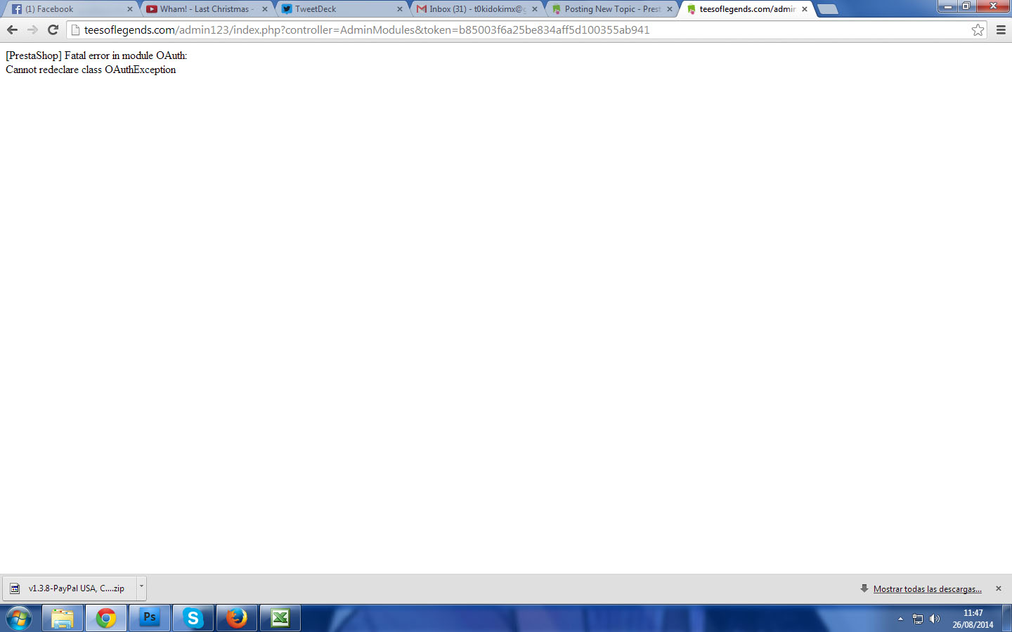 t0kidoki Posted August 26, 2014 Share Posted August 26, 2014 Hi! Trying to click the Modules Tab in the Back Office I get the following error: [PrestaShop] Fatal error in module OAuth:Cannot redeclare class OAuthException Does anybody know how can I fix this? Link to comment Share on other sites More sharing options...