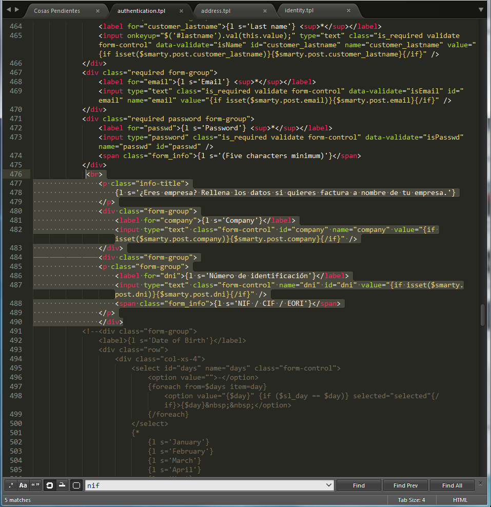 Softdesire Posted August 27, 2014 Author Share Posted August 27, 2014 Mucha gracias jesa por tu respuesta. Adjunto mando un pantallazo de los cambios que realizamos en "authentication.tpl". El problema es que no da ningún error, el proceso de registro sigue para adelante, y guarda también el campo de "Razón Social", el cual se muestra en "Sus datos personales", donde copiamos el mismo código. El que no se muestra es el de "Número de identificación" Dejo adjunto también el apartado de Datos personales, en donde aparece la "Razón social" pero no el "número de identificación". *He quitado los campos de nombre, apellido y dirección de correo electrónico por razones obvias. Gracias y perdón si me explicar o detallar el problema. Link to comment Share on other sites More sharing options...