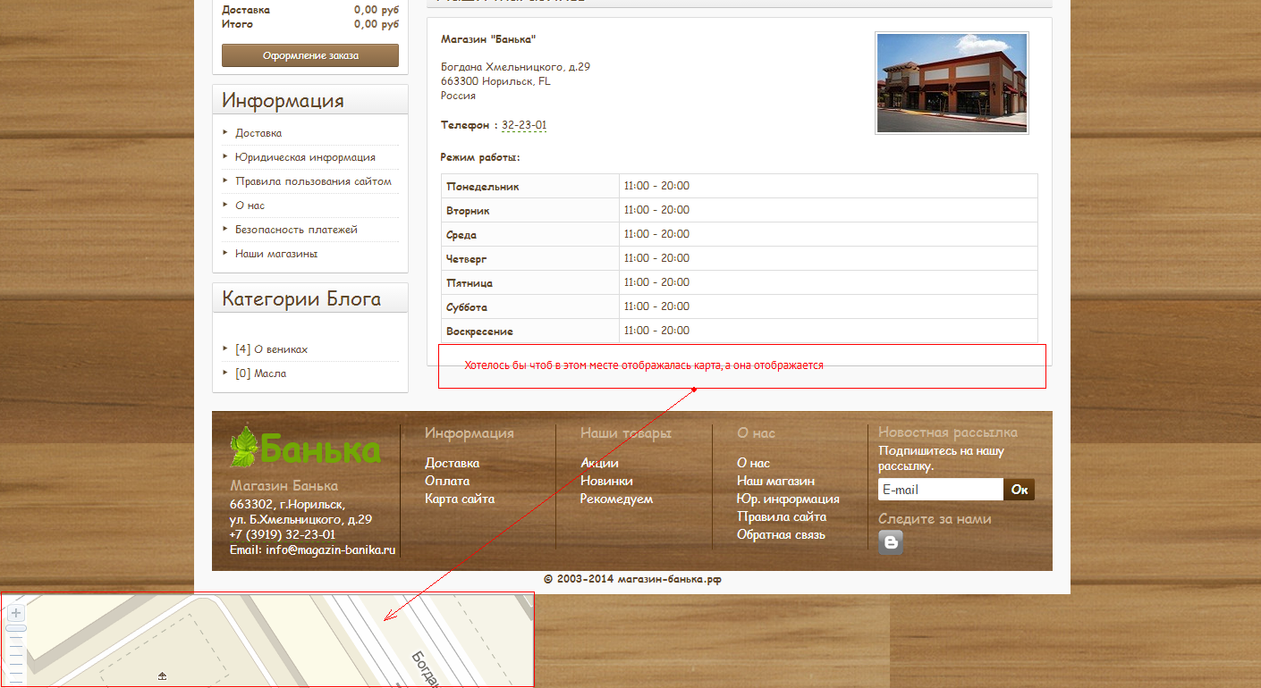 Chistota Posted August 27, 2014 Share Posted August 27, 2014 (edited) Друзья подскажите куда следует поместит код(если конечно правильно назвал) В 2 GIS получил код и там же мне посоветовали поместить на сайт обернув его в {literal} {/literal} {literal} <a id="firmsonmap_biglink" href="http://maps.2gis.ru/#/?history=project/norilsk/center/88.205465633563,69.348915918972/zoom/18/state/widget/id/10696577395982871/firms/10696577395982871">Перейти к большой карте</a> <script charset="utf-8" type="text/javascript" src="http://firmsonmap.api.2gis.ru/js/DGWidgetLoader.js"></script> <script charset="utf-8" type="text/javascript">new DGWidgetLoader({"borderColor":"#a3a3a3","width":"600","height":"600","wid":"60548a647a4aa9380cfe516837177e5a","pos":{"lon":"88.205465633563","lat":"69.348915918972","zoom":"18"},"opt":{"ref":"hidden","card":["name","contacts","schedule","payings"],"city":"norilsk"},"org":[{"id":"10696577395982871"}]});</script> <noscript style="color:#c00;font-size:16px;font-weight:bold;">Виджет карты использует JavaScript. Включите его в настройках вашего браузера.</noscript> {/literal} Нашел в своей теме файл stores.tpl но вот куда вставить код от 2GIS не знаю. Пробовал всавлять в разные места но то карта появляется не там где нужно. {if $simplifiedStoresDiplay} {if $stores|@count} {foreach $stores as $store} <div class="store-small"> {if $store.has_picture}<p><img src="{$img_store_dir}{$store.id_store}.jpg" alt="{$store.name|escape:'htmlall':'UTF-8'}" /></p>{/if} <p class="bold">{$store.name|escape:'htmlall':'UTF-8'}</p><br /> <p>{$store.address1|escape:'htmlall':'UTF-8'}</p> {if $store.address2}<p>{$store.address2|escape:'htmlall':'UTF-8'}</p>{/if} <p>{$store.postcode} {$store.city|escape:'htmlall':'UTF-8'}{if $store.state}, {$store.state}{/if}</p> <p>{$store.country|escape:'htmlall':'UTF-8'}</p> {if $store.phone}<br /><p><span class="bold">{l s='Phone :' js=0}</span> {$store.phone}</p>{/if} {if isset($store.working_hours)} {$store.working_hours} {else} {$sh = unserialize($store.hours)} {if $sh[0] OR $sh[1] OR $sh[2] OR $sh[3] OR $sh[4] OR $sh[5] OR $sh[6]} <div class="clear"></div> <br /> <span class="store_hours bold">{l s='Store hours :'}</span> <br /> <table> {if $sh[0]}<tr><td class="first_item bold">{l s='Monday'}</td><td>{$sh[0]}</td></tr>{/if} {if $sh[1]}<tr><td class="first_item bold">{l s='Tuesday'}</td><td>{$sh[1]}</td></tr>{/if} {if $sh[2]}<tr><td class="first_item bold">{l s='Wednesday'}</td><td>{$sh[2]}</td></tr>{/if} {if $sh[3]}<tr><td class="first_item bold">{l s='Thursday'}</td><td>{$sh[3]}</td></tr>{/if} {if $sh[4]}<tr><td class="first_item bold">{l s='Friday'}</td><td>{$sh[4]}</td></tr>{/if} {if $sh[5]}<tr><td class="first_item bold">{l s='Saturday'}</td><td>{$sh[5]}</td></tr>{/if} {if $sh[6]}<tr><td class="first_item bold">{l s='Sunday'}</td><td>{$sh[6]}</td></tr>{/if} </table> {/if} {/if} </div> {/foreach} {/if} {else} <script type="text/javascript"> // <![CDATA[ var map; var markers = []; var infoWindow; var locationSelect; var defaultLat = '{$defaultLat}'; var defaultLong = '{$defaultLong}'; var translation_1 = '{l s='No stores found, try selecting a wider radius.' js=1}'; var translation_2 = '{l s='store found - see details :' js=1}'; var translation_3 = '{l s='stores found - see all results :' js=1}'; var translation_4 = '{l s='Phone :' js=1}'; var translation_5 = '{l s='Get Directions' js=1}'; var translation_6 = '{l s='Not found' js=1}'; var hasStoreIcon = '{$hasStoreIcon}'; var distance_unit = '{$distance_unit}'; var img_store_dir = '{$img_store_dir}'; var img_ps_dir = '{$img_ps_dir}'; var searchUrl = '{$searchUrl}'; var logo_store = '{if isset($logo_store)}{$logo_store}{/if}'; //]]> </script> <p>{l s='Enter a location (e.g. zip/postal code, address, city or country) in order to find the nearest stores.'}</p> <p> <label for="addressInput">{l s='Your location :'}</label> <input type="text" name="location" id="addressInput" value="{l s='Address, zip/postal code, city, state or country'}" onclick="this.value='';" /> </p> <p> <label for="radiusSelect">{l s='Radius :'}</label> <select name="radius" id="radiusSelect"> <option value="15">15</option> <option value="25">25</option> <option value="50">50</option> <option value="100">100</option> </select> {$distance_unit} <img src="{$img_ps_dir}loader.gif" class="middle" alt="" id="stores_loader" /> </p> <p class="clearfix"> <input type="button" class="button" onclick="searchLocations();" value="{l s='Search'}" /> </p> <div><select id="locationSelect"><option></option></select></div> <div id="map"></div> <table cellpadding="0" cellspacing="0" border="0" id="stores-table" class="table_block"> <tr> <th>{l s='#'}</th> <th>{l s='Store'}</th> <th>{l s='Address'}</th> <th class="center">{l s='Distance'}</th> </tr> </table> {/if} Edited August 27, 2014 by Chistota (see edit history) Link to comment Share on other sites More sharing options...