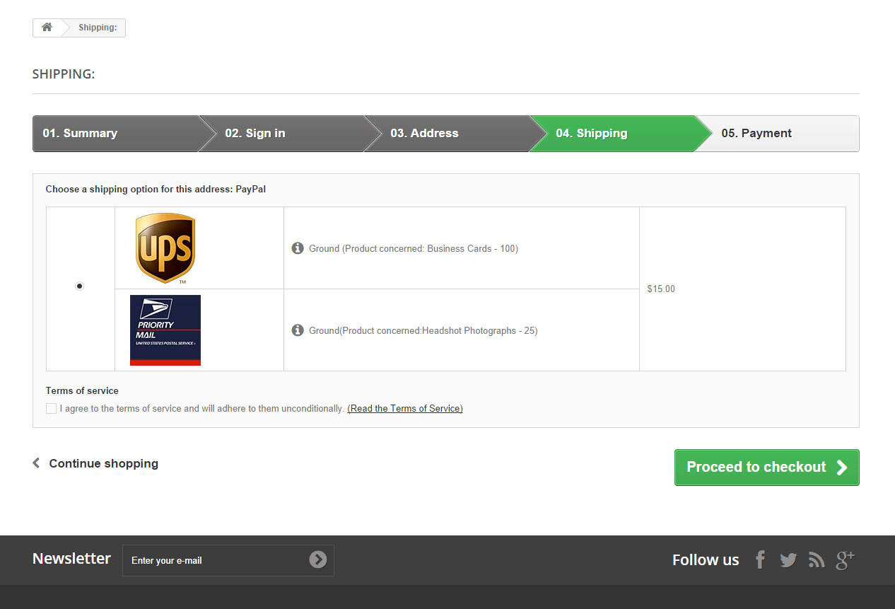 rhill Posted September 1, 2014 Share Posted September 1, 2014 (edited) Hello, I am setting up a new store (ver. 1.6.0.9) that has different items using different shipping carriers. Business cards are shipped via UPS and the photographs are shipped via USPS. If you order separately, works perfect. But, if you order together the system does not know what to do. See attached image, can't move past that point. If you click Proceed to Checkout, the screen refreshes, no error messages, but does not go to the next page. It's correct for adding the shipping cost, but I need them both. Or is there a way to bypass the shipping selection and automatically add the shipping? Please help!!!! Thanks. Edited September 1, 2014 by rhill (see edit history) Link to comment Share on other sites More sharing options...