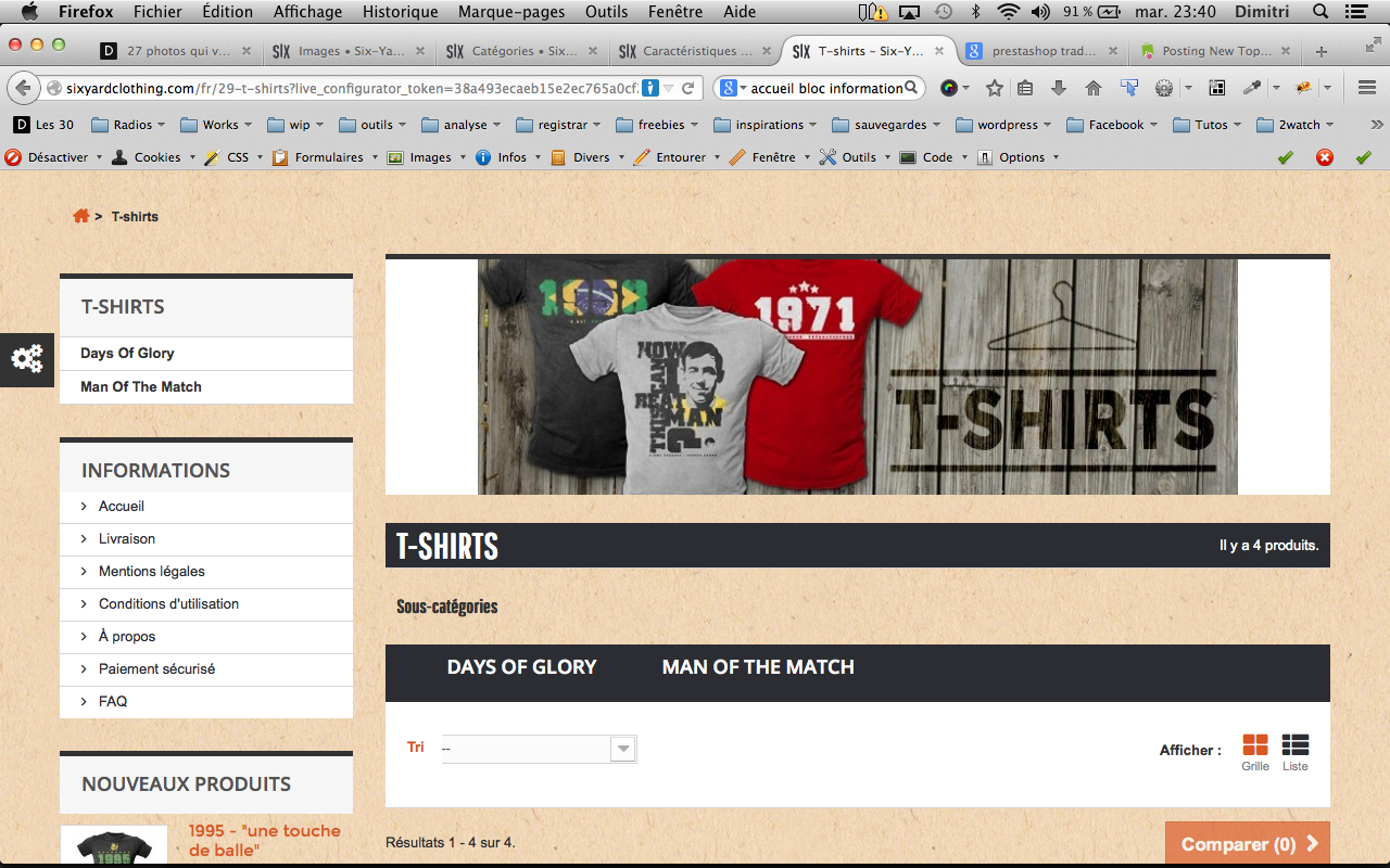 Dreadpoule Posted September 2, 2014 Share Posted September 2, 2014 (edited) Hello there Je suis en train de tafer sur un Prestashop v1.6.0.7 avec le thème Bootstrap par défaut. Mon soucis c'est que je ne vois pas où traduire en anglais le lien Accueil qui se trouve en tête du bloc Information, sur certaines pages, dans la left-side-bar (cette colonne de liens où l'on retrouve aussi le cadre Déjà-vu, Mots-clés ou encore Nos Magasins). Merci de votre aide !! (et bonne nuit surtout ^^) Edited September 2, 2014 by Dreadpoule (see edit history) Link to comment Share on other sites More sharing options...