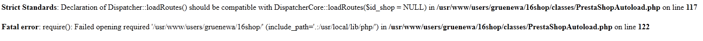 BoKr Posted September 3, 2014 Share Posted September 3, 2014 (edited) Hallo ich kann die Seite "Feldnamen" in Übersetzungen Lokalisierung Übersetzungen nicht mehr öffnen. Es wird nur eine weiße Seite geladen. Debugging sagt folgendes: <br /> <b>Strict Standards</b>: Declaration of Dispatcher::loadRoutes() should be compatible with DispatcherCore::loadRoutes($id_shop = NULL) in <b>/usr/www/users/162/shop/classes/PrestaShopAutoload.php</b> on line <b>117</b><br /> <br /> <b>Fatal error</b>: require(): Failed opening required '/usr/www/users/162/shop/' (include_path='.:/usr/local/lib/php/') in <b>/usr/www/users/162/shop/classes/PrestaShopAutoload.php</b> on line <b>122</b><br /> Strict Standards: Declaration of Dispatcher::loadRoutes() should be compatible with DispatcherCore::loadRoutes($id_shop = NULL) in /usr/www/users/162/shop/classes/PrestaShopAutoload.php on line 117 Edited September 3, 2014 by B.Köring (see edit history) Link to comment Share on other sites More sharing options...