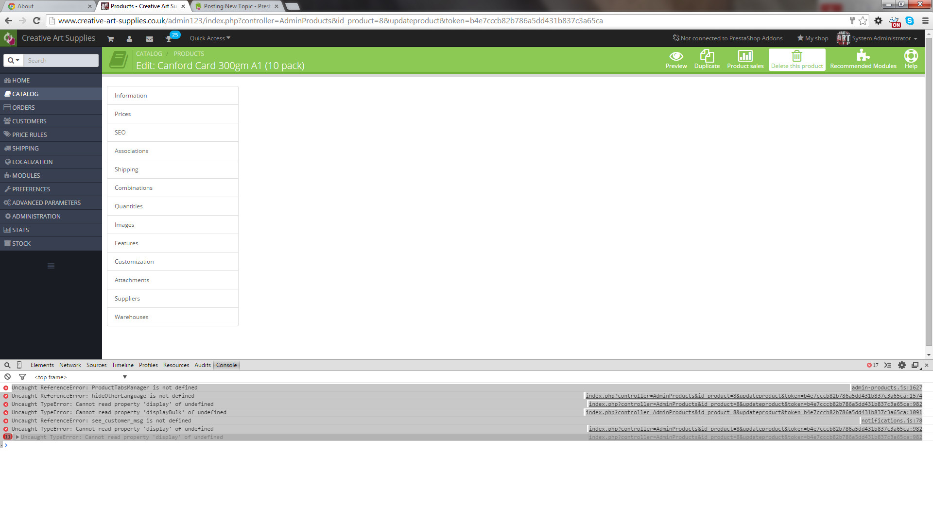 Creativeartsupplies Posted September 3, 2014 Share Posted September 3, 2014 When going to create a new item or edit and existing item. the information tab is the only one with info to edit. The other tabs have nothing, just white box. Here is the error Uncaught ReferenceError: ProductTabsManager is not defined admin-products.js:1627 Uncaught ReferenceError: hideOtherLanguage is not defined index.php?controller=AdminProducts&id_product=8&updateproduct&token=b4e7cccb82b786a5dd431b837c3a65ca:1574 Uncaught TypeError: Cannot read property 'display' of undefined index.php?controller=AdminProducts&id_product=8&updateproduct&token=b4e7cccb82b786a5dd431b837c3a65ca:982 Uncaught TypeError: Cannot read property 'displayBulk' of undefined index.php?controller=AdminProducts&id_product=8&updateproduct&token=b4e7cccb82b786a5dd431b837c3a65ca:1091 Uncaught ReferenceError: see_customer_msg is not defined notifications.js:78 Uncaught TypeError: Cannot read property 'display' of undefined index.php?controller=AdminProducts&id_product=8&updateproduct&token=b4e7cccb82b786a5dd431b837c3a65ca:982 Link to comment Share on other sites More sharing options...