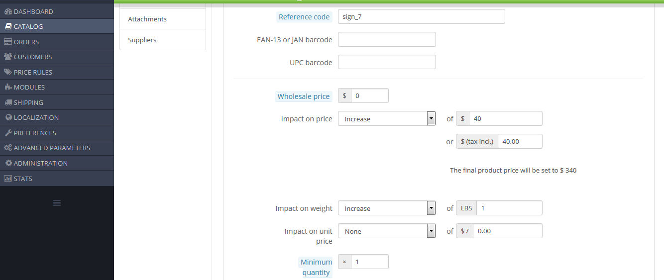 someguyincali Posted September 9, 2014 Share Posted September 9, 2014 (edited) I am using Prestashop version 1.6.0.9 with the default theme. I have set up a product that has a variation. It is supposed to increase the price. I have added the price increase to the product atttribute as follows: After going all the way through checkout the price is never impacted. Anyone have a clue as to why this is not working? Here is a screenshot of the entire attribute table: Edited September 9, 2014 by someguyincali (see edit history) Link to comment Share on other sites More sharing options...
