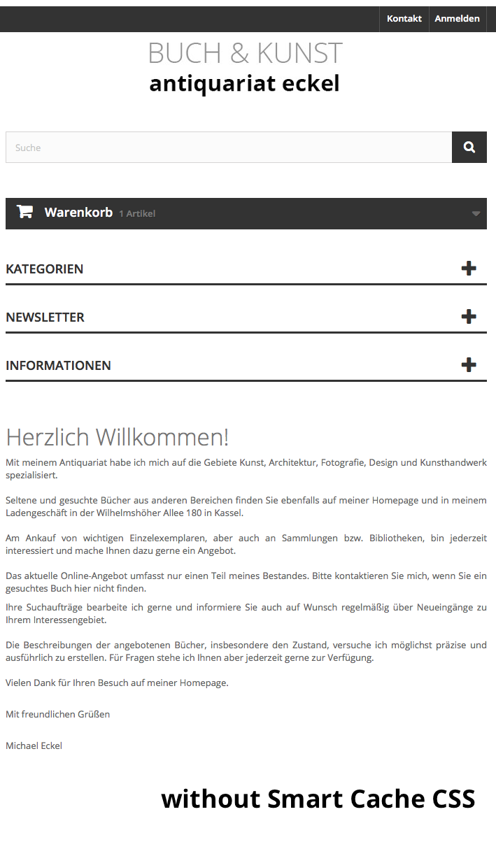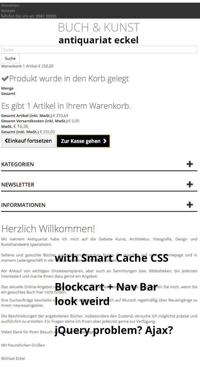 philipp_e Posted September 12, 2014 Share Posted September 12, 2014 Hello everyone, I got a problem with Smart Cache for CSS and the Blockcart dodule using AJAX. If I disable Smart Cache for CSS, everything is fine, but slow. If I enable it und resize the browser window to a smaller one or use the smartphone, the Blockcart module looks weird us and the navbar too. jQuery problem? I duplicated the default theme from 1.6.0.8 and modified it. If I change over to the default theme, same problem. Url is www.kunstbuch-eckel.de/shop Please see the screenshots! Thanks! Link to comment Share on other sites More sharing options...