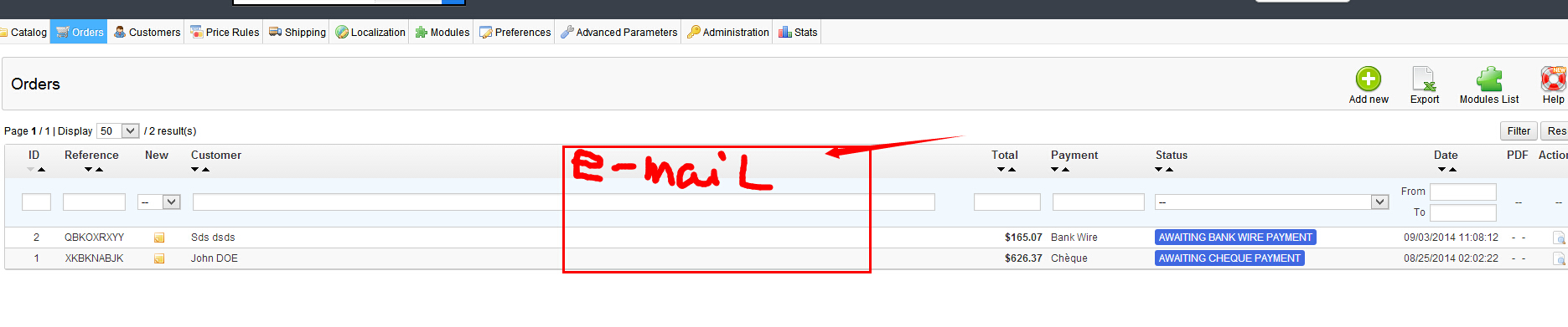easynow Posted September 13, 2014 Author Share Posted September 13, 2014 open file: /controllers/admin/AdinOrdersController.php there is a code with fields list: $this->fields_list = array( 'id_order' => array( 'title' => $this->l('ID'), 'align' => 'center', 'width' => 25 ), 'reference' => array( 'title' => $this->l('Reference'), 'align' => 'center', 'width' => 65 ), 'new' => array( 'title' => $this->l('New'), 'width' => 25, 'align' => 'center', 'type' => 'bool', 'tmpTableFilter' => true, 'icon' => array( 0 => 'blank.gif', 1 => array( 'src' => 'note.png', 'alt' => $this->l('First customer order'), ) ), 'orderby' => false ), 'customer' => array( 'title' => $this->l('Customer'), 'havingFilter' => true, ), add there new field: 'email' => array( 'title'=>$this->l('email'), 'havingFilter' => true, ), effect: Thanks so much. It works fine. And how to get delivery address country code like USA? Link to comment Share on other sites More sharing options...
