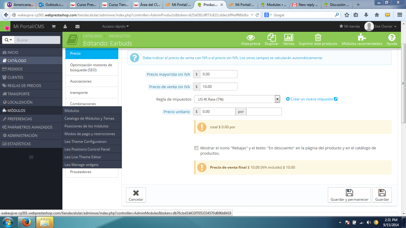 Alfali Posted September 15, 2014 Share Posted September 15, 2014 Estoy tratando de asignar precio a un producto. He seguido las instrucciones del curso prestashop donde explica que para asignar el precio a un producto, debemos colocar el precio de venta con iva o el precio de venta sin iva, y que los otros campos se calcularian automaticamente. He puesto el precio sin iva, y no veo que los otros campos se calculen automaticamente. Por que si ya cambie a moneda dollar por que me sale en el mensaje hablando de iva, si estoy trabajando con dollar. Espero y me saquen de esta duda para seguir adelante en mi creacion de mi tienda virtual con prestashop. Gracias Adjunto el archivo donde especificamente tengo el problema ya mencionado Link to comment Share on other sites More sharing options...