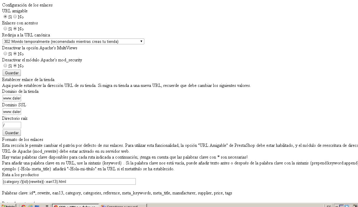 jcdli Posted September 17, 2014 Author Share Posted September 17, 2014 (edited) Buenos días, Nadie. En ps_shop_url, en los campos que mencionas tengo lo siguiente: - domain: www.daler-rowney-online.com - domain_ssl: www-daler-rowney-online.com - physical_uri: / Por otro lado, sí que tengo acceso al panel de al tienda, aunque creo que no puedo añadir módulos (intenté ayer añadir uno, pero no me dejó. Probaré hoy con éste que comentas). Y procedo a vaciar el caché(smarty/caché y cahé/smarty/compile, tal y como dice la página de victor ródenas (creo que había que dejar el index.php. o similar. Ahora miro para asegurarme). En el panel de la tienda, en SEO y URLs - Dominio, Dominio SSL y Directorio Raiz aparecd lo mismo qeu en ps_shop_url. Luego te cuento. ¡¡¡¡¡ Y mil gracias por tu tiempo y paciencia !!!!! c Edited September 17, 2014 by jcdli (see edit history) Link to comment Share on other sites More sharing options...